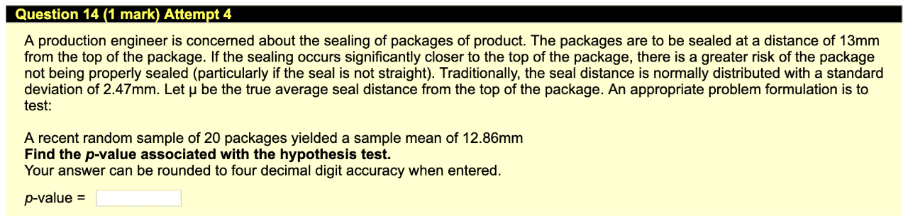 We are given $\displaystyle \mu = 13, \quad \sigma = 2.47, \quad \bar{x} = 12.86 , \quad n = 20 $.