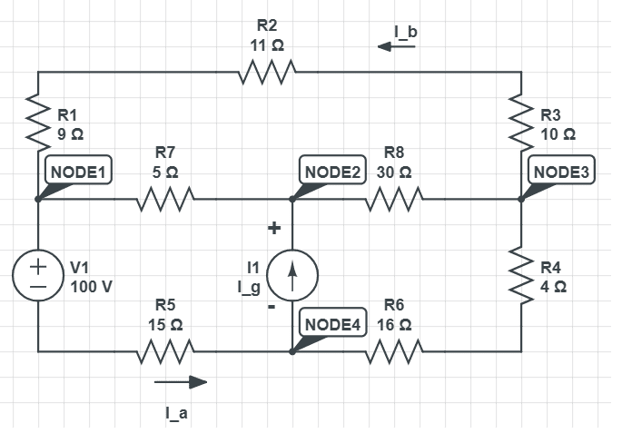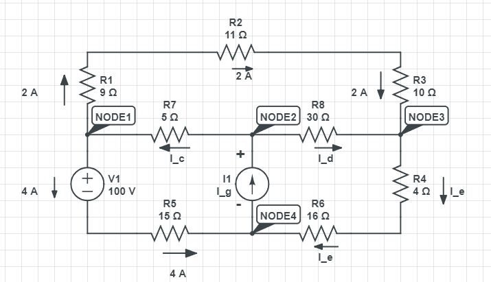 Now to my attempt, first, I wrote 4 KCEQ and 2 KVEQ: $$N_{{1}}:4A+2A=I_{{c}}, I_{{c}}=6A$$ $$N_{{2}}:I_{{d}}+I_{{c}}=I_{{g}}$$ $$N_{{3}}:I_{{d}}+2A=I_{{e}}$$ $$N_{{4}}:I_{{g}}=I_{{e}}+4A$$ $$V_{{4214}}:-V_{{g}}+30V+100V+60V=0, V_{{g}}=190V$$ $$V_{{4234}}:-190V+I_{{d}}*30\,\Omega+I_{{e}}*4\,\Omega+I_{{e}}*16\,\Omega=0$$