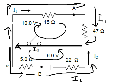 Top loop(clockwise): +10V1 - 15*I1 - 47*I1 + (0V since I'm assuming no Voltage drop across switch) = 0