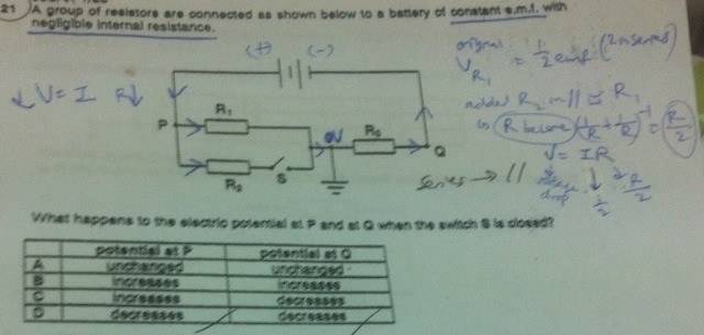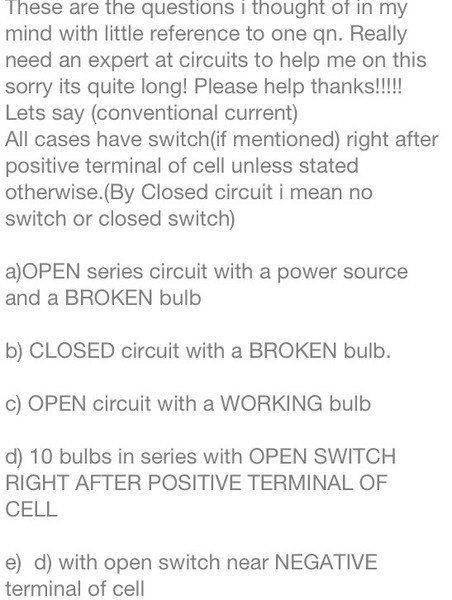 There is an ongoing exploration of how potential differences manifest in circuits with broken components. Some participants express confusion about when voltage drops occur and seek clarification on specific circuit configurations. Guidance has been offered regarding the relationship between current flow and potential differences, but no consensus has been reached on all points.