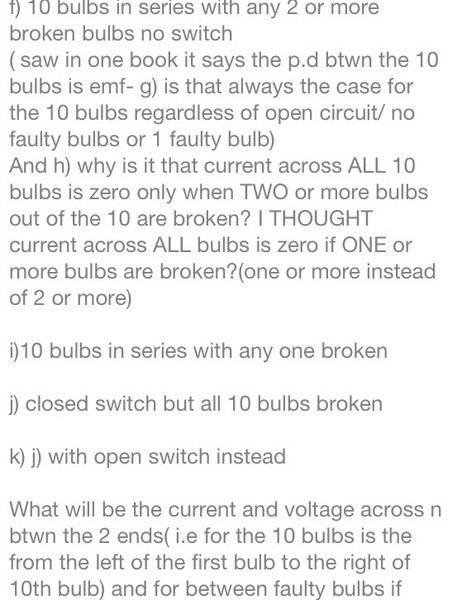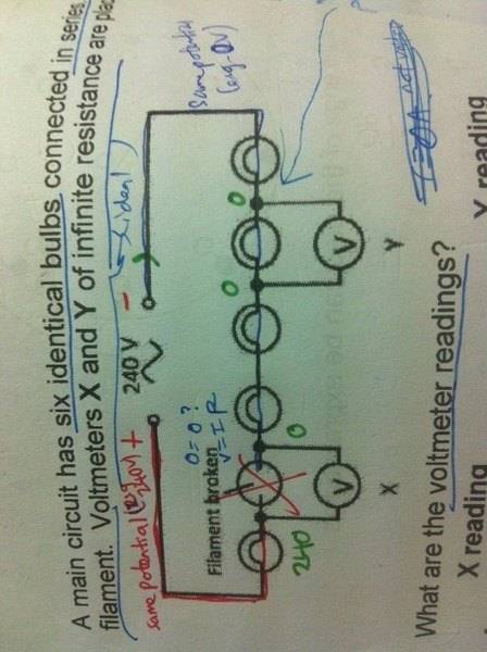 The discussion revolves around understanding circuit behavior, particularly focusing on potential differences in simple circuit setups. Participants explore concepts related to voltage drops, current flow, and the effects of broken components in series circuits.