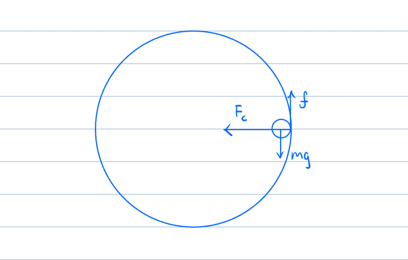So I take torque which is equal to F×R and also equal to I×α (α being angular acceleration). and since it is rolling without slipping a=r×α. Then I took a=v^2/r from circular motion (This one I don't know if it can actually be used but it is the only equation I can think of that links them) Then for sphere, I=(2/5)×mr^2. Combining the equation gives me F=8/7mg. I then minus off the weight as I thought weight would be opposite direction. But now to think of it, it is net torque so maybe I shouldn't minus weight off as it is already Fnet?