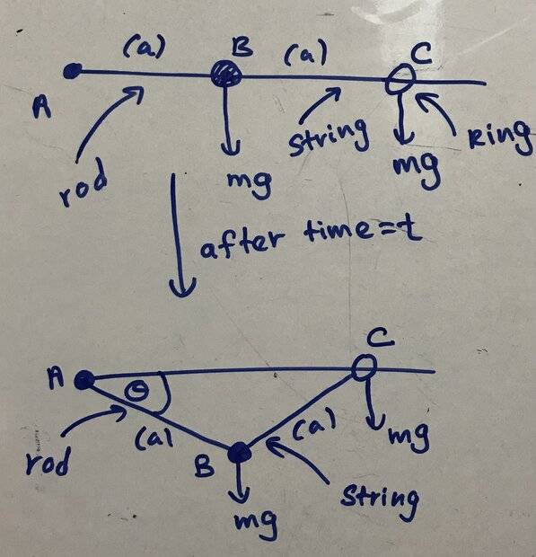 - weightless rod AB of length a is free to rotate about a fixed end A. At its other end B, a particle of mass m is attached. B is connected to a ring C of mass m by an inelastic string of length a. The ring C slides smoothly along another fixed horizontal rod passing through A. Initially, points A, B, and C are aligned in a straight line with AC = 2a