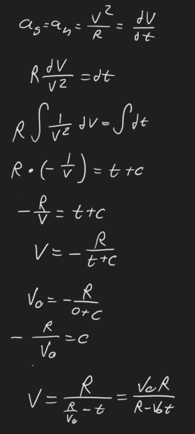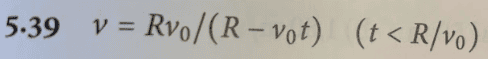 - A particle moves in a circular path of radius R in such a way that the tangential acceleration is equal to the normal acceleration. Determine the velocity as a function of time t and the initial velocity (v_0).