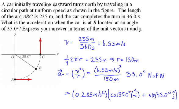 The discussion focuses on the behavior of centripetal acceleration in circular motion, specifically why it is negative in the i direction and positive in the j direction. Participants emphasize the importance of vector representation, suggesting that graphing the vectors can clarify their directions. The vector in question is represented as -i cos 35 + j sin 35, indicating its orientation in a Cartesian coordinate system. Understanding these vector components is crucial for accurately analyzing centripetal acceleration in physics.