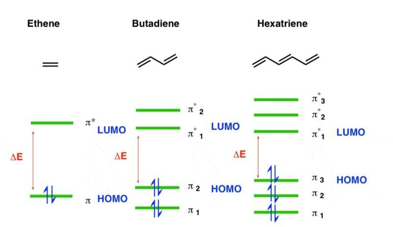 For example, comparing ethene and butadiene there is a batochromic shift only if we consider the π2 --> π*1 transition (see image), that is, the HOMO-LUMO transition.