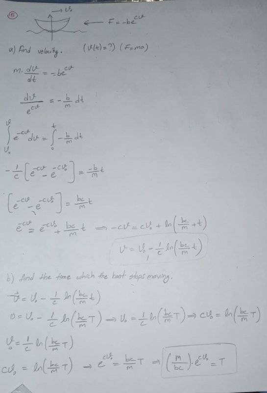 - A boat with initial velocity Vo starts to slow down by the resistive force F=-b(e^cv) (b and c are constants v is the velocity of the boat) by water when the engines are stopped.