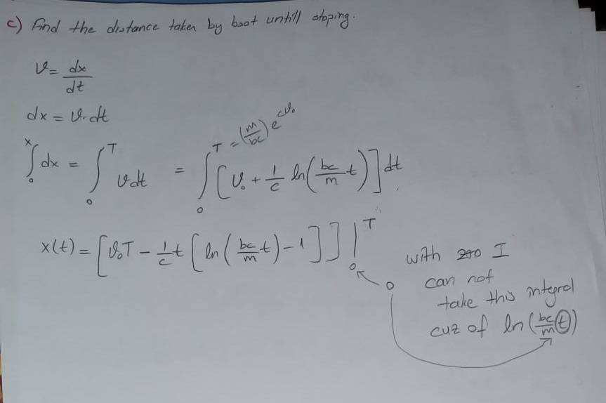 I solved this question until the end of the "c)Find the distance until the boat completely stop"