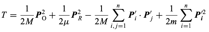 Hello! When the kinetic energy of a molecule is written in its CM frame we get the formula attached. The first term is the kinetic energy of the CM frame with respect to the lab frame, the second term is the kinetic energy associated with the distance between the nuclei and the last term is the kinetic energy of the electrons with respect to the CM. Can someone help me understand what the 3rd term is? It seems like all the possible motions are taken into account so I am not sure what that is (it comes out naturally from the mathematical derivation, but I am not sure what it is physically). Thank you!