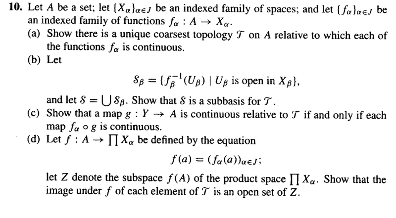 At the moment, I am dealing with part (a). What I am perplexed by is the ordering of the parts. If the subbasis in part (b) does indeed generate this coarsest topology, why wouldn't showing this be included in part (a)? What does the author intend I do for part (a), if not showing that the subbasis in part (a) generates this coarsest topology. To me it seems that, in order to properly solve part (a), I need to explicitly construct a topology relative to which are functions are continuous . But how do I this if not by constructing a collection of subbasic elements like that in part (b)?
