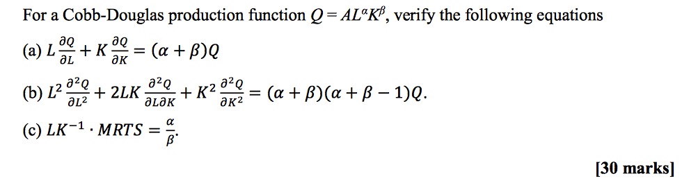 For a Cobb-Douglas production function Q = AL^α K^β, verify the following equations: