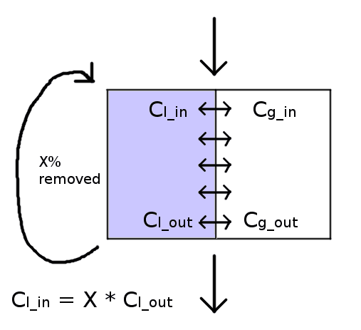 X% of the liquid is removed and replaced with fresh (0% concentration) each runthrough, so the incoming liquid concentration C_l_in is X% of the outgoing liquid concentration C_l_out. The incoming gas concentration C_g_in is known. The diffusion constant and Henry's law constants are also known, as is the length of time the two are in contact, the total contact area, and the flow rates of both the liquid and gas phases