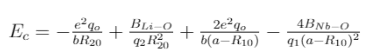 If we considered that the Nb ion with charge q1 is displaced from its centrosymmetric position by (a/2) - R10 while the Li ion with charge q2 is displaced from its centrosymmetric position by a distance R20 and taking in account that the interaction energy between crystal planes in LiNbO3 is given by the following equation ( a is the distance between two oxygen planes and b is the lattice constant )