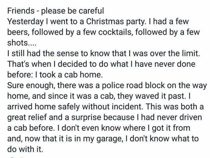 Reminds me of a party my girlfriend had to take a few of us home. And of course she wasn't completely sober herself, just less than the rest of us, and of course there have also been a police control. The officer took a look into the car, saw the only girl driving and the rest so drunk, that he couldn't impossibly tell who was the most responsible for the atmosphere in the car, and he waved us by.davenn said:ignoring the fact we are well past Christmas![]()