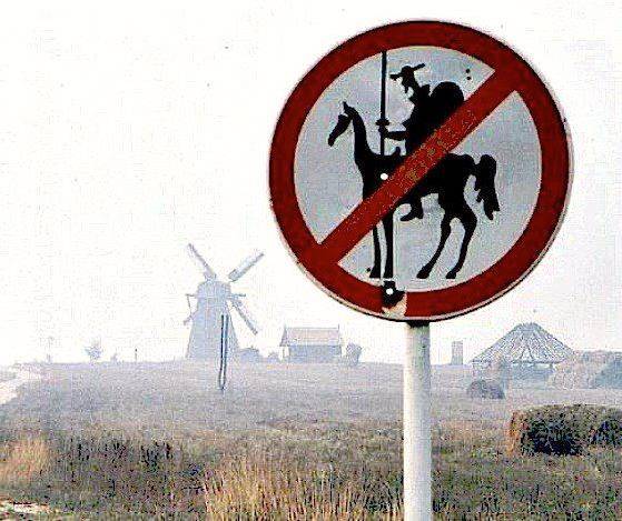 I visited a windmill in York, and they had a poster with a sketch of Quijote on horseback charging a windmill, with a big red circle and diagonal bar over the top...