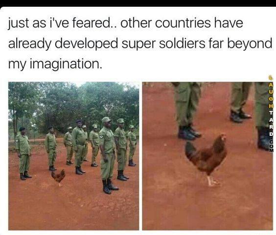 The bird seems to have replaced a man in the second rank. Is this the origin of the expression "to chicken out"?