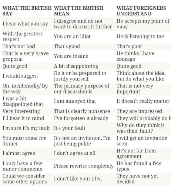 Another occasion (having my English colleague proof read my email, addressed to other colleagues across the channel): Me: "But this is not true!" Her: "I know, but it is what you should write. I am English, we lie."