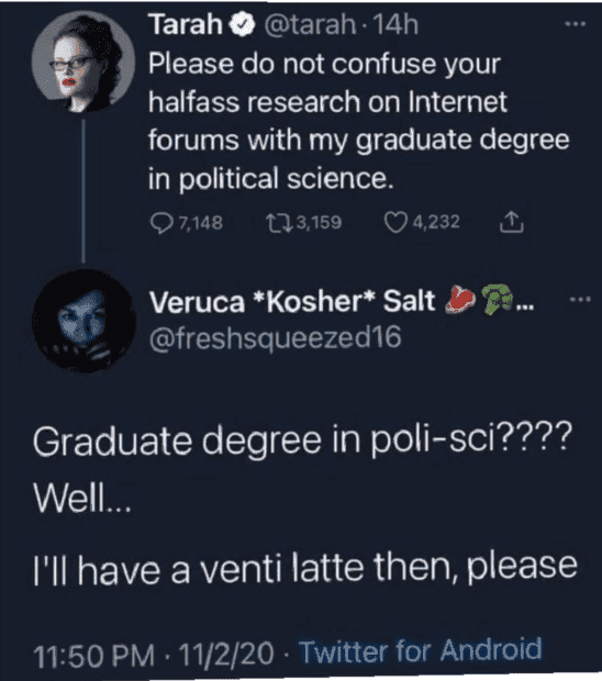 I don't know what prompted that tweet (although from the date the context is obviously the 2020 US presidential election), but the reply seems somewhat ill-judged. Never heard of her myself, but "Tarah" has her full name in her profile, from which you can find a fairly impressive resume in her Wikipedia bio.WWGD said: