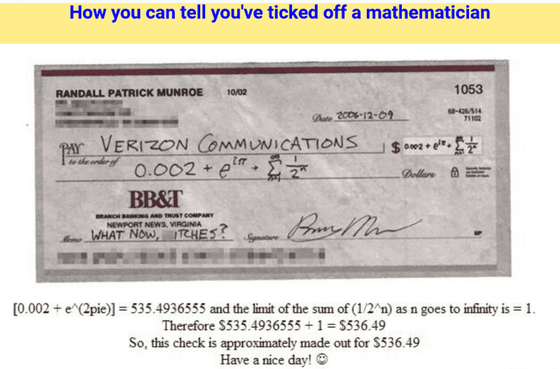 The check was made out for $.002, which is the amount Randall Munroe was billed for. No amount of explanation on his part got through to the clueless Verizon employee he talked to.