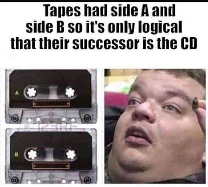That reminds me of the Monty Python vinyl LP Matching Tie and Handkerchief. If you played the B side, flipped it to play the A side, then flipped it again, you really did (50% of the time) get a secret C side.Ibix said:Turn the tape over twice to access the secret C side...