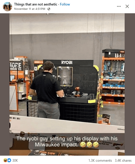 Request to explain the joke: is the point that the red thing near the guy's right hand is a power drill made by a competitor of the company he works for?berkeman said: