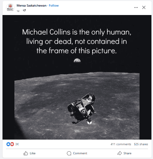 That was only until his name was placed at the start of the top line.berkeman said:Michael Collins is the only human, living or dead, not contained in the frame of this picture.