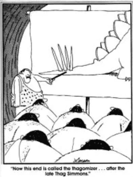 Among paleontologists, the four-spiked tail of Stegosaurus is called a "thagomizer." It is one of a few terms inspired by one of Gary Larson's beloved "Far Side" cartoons: a caveman points to a slide of a Stegosaurus tail and names the nasty-looking structure in honor of "the late Thag Simmons." Humans and Stegosaurus missed each other by over 140 million years, but the joke was so perfect that paleontologists couldn't help but informally use it.
