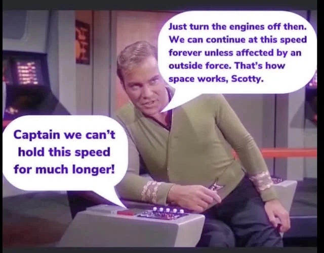 "(Oh woe! Why do we have to comply with Starfleet Orbital Regs that set standard orbit at, like, 50 miles altitude!)"