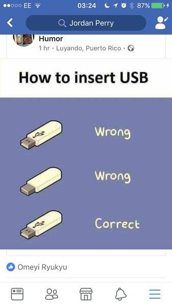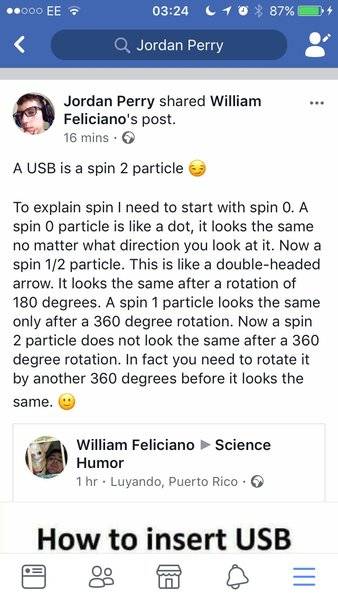 The post gets the spin assignments wrong. You need a rotation by 360 degrees divided by the spin. 720 degrees for spin 1/2 (USB in the joke), 360 for spin 1 (USB as it should be) and 180 for spin 2 (USB-c).