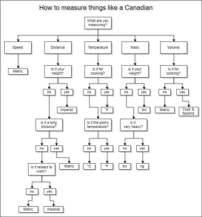 Having holidayed in Canada recently, My wife and I were constantly giggling at the crazy mix of imperial and metric eg.