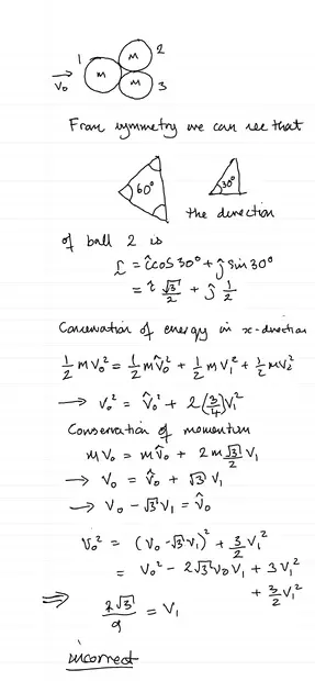 - Two identical frictionless balls are symmetrically hit by a third identical ball with velocity v_0i. Find all subsequent velocities.