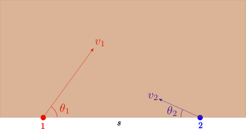 - Shown in the picture below, two particles ##1## and ##2## are set into motion simultaneously from the edge of a table with velocities ##v_1## and ##v_2## at angles ##\theta_1## and ##\theta_2##. If their initial distance of separation is ##\boldsymbol{s}##, answer the following questions :