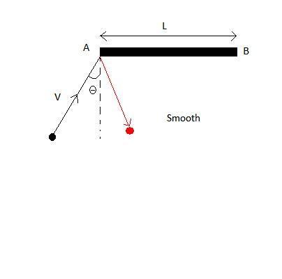 A thin rod AB of mass ##m_{1}## and of length ##l## is placed on a smooth horizontal ground. A point sized particle of mass ##m_{2}## having a velocity ##v## making an angle ##\theta##with the line perpendicular to ##AB## collides with the rod at point ##A##.