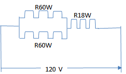 One 18 watt lamp and two 60-watt light bulb are plugged into a 120V circuit. For either DC or AC, the two bulbs are connected each other in parallel and in series with the lamp in the same circuit. Calculate;