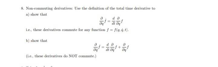 a) show that ##(∂ /∂q)(d/dt)f(q,q˙,t) = (d /dt)(∂/∂q)f(q,q˙,t)## i.e. these derivatives commute for any function ##f = f(q, q˙,t)##.