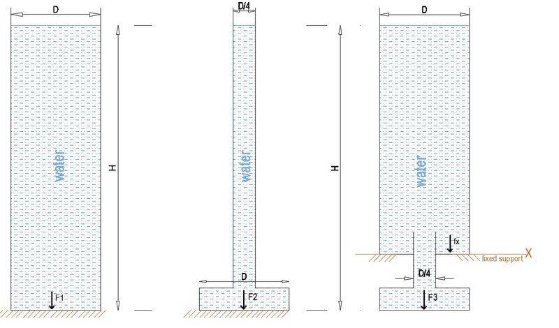1st and 2 nd water containers sit on ground and 3rd type of water container sit on fixed support along X axis and bottom parts are suspended in air , pls see picture , the drawing is half cross sections of cylinders