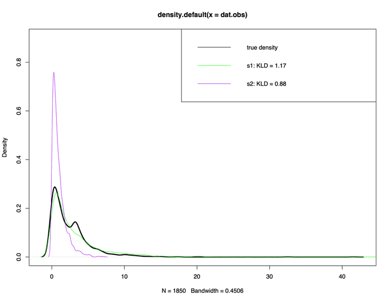 I’m currently evaluating the "realism" of two survival models in R by comparing the respective Kullback-Leibler divergence between their simulated survival time dataset (`dat.s1` and `dat.s2`) and a “true”, observed survival time dataset (`dat.obs`). Initially, directed KLD functions show that `dat.s2` is a better match to the observation: