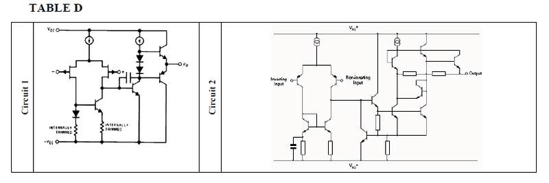 d) TABLE D shows the internal circuitry of two op-amps. Identify, with justification, which op-amp circuit is most likely to belong to which op-amp in TABLE A.