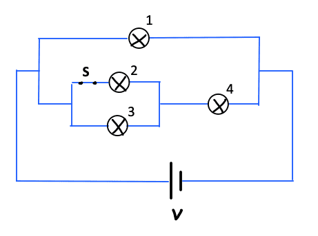 Four identical light bulbs are connected to a battery as shown in the diagram. Switch S is originally closed. If switch S is opened, what happens to the brightness of each bulb?