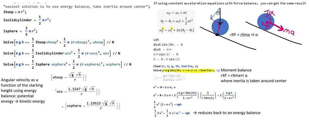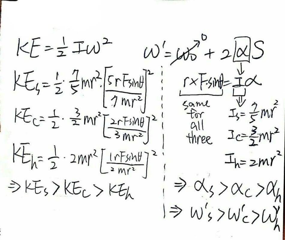 - A solid sphere, a solid cylinder, and a hoop all have the same mass and radius. Each are sent down identical inclined planes starting from rest. Their kinetic energies at the bottom of the incline are Ksphere, Kcylinder, and Khoop. Which of the following is true?