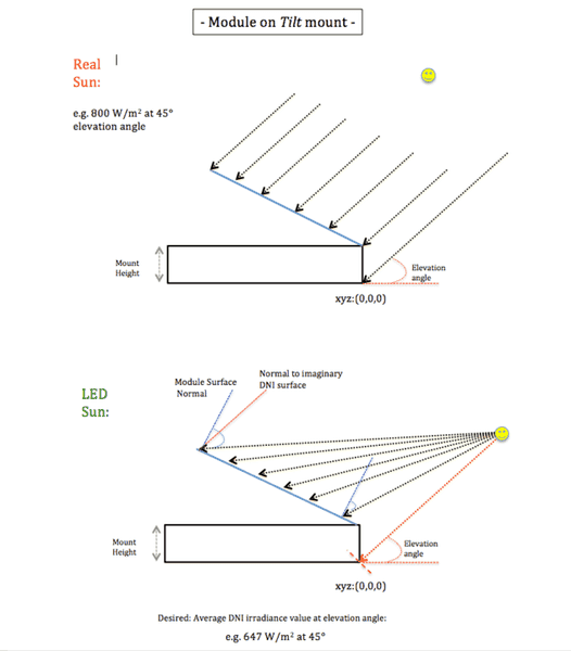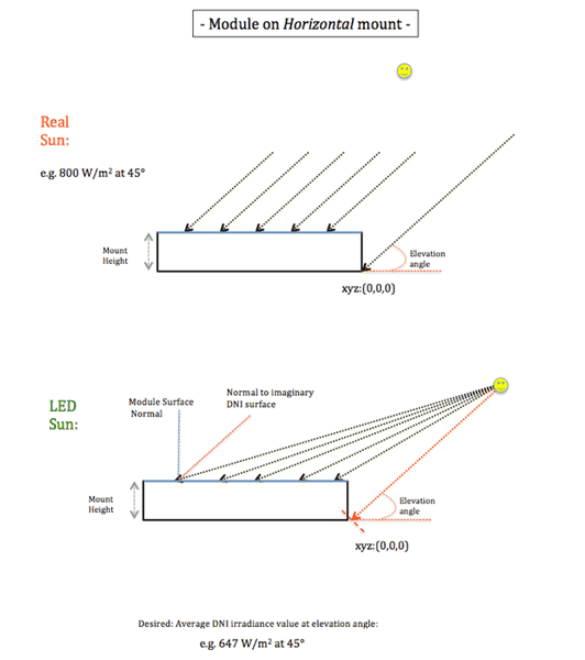 Hi. To frame things generally, I have a variable indoor light source that shines on an inclined plane. More specifically, I have a 3-D LED matrix that shines light onto a miniature pv array. Essentially, I am using an indoor “sun” to shine on the array. I measure the energy produced, and compare it with the energy predicted for the real sun with the same sunpath.