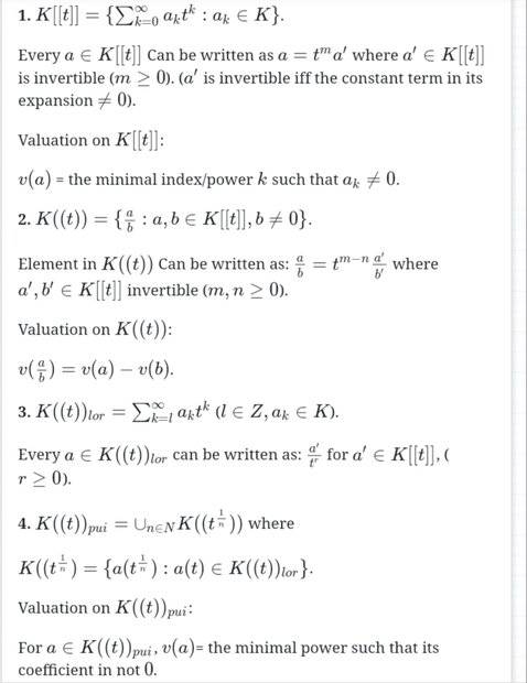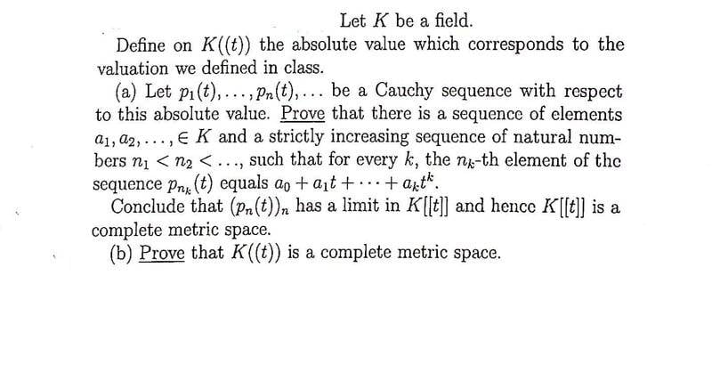 I had difficulty showing this no matter what I tried in (a) I am not getting it. Here for p(t) in K[[t]] : ## |p|=e^{-v(p)} ## where v(p) is the minimal index with a non-zero coiefficient.