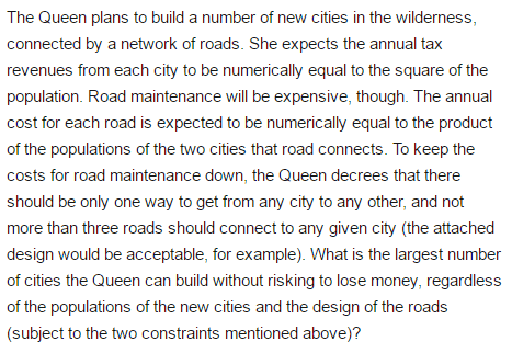 i'm having difficulty generalizing because the problem asks for the maximum number of cities REGARDLESS of population and road design. (road design is really vague for me).