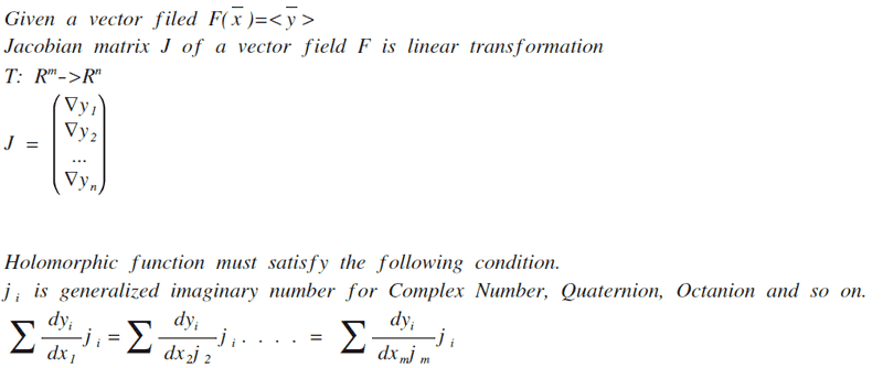 In a real analysis, its derivative is expressed as a Jacobian matrix because each field component would have a different incremental because the components are independent of each other.However, complex differentiation is just like the case of single real variable differentiation but defined on the complex number set, which imposes a stronger restriction. And this can be generalizd to quaternion, octanion and so on.Is this right?