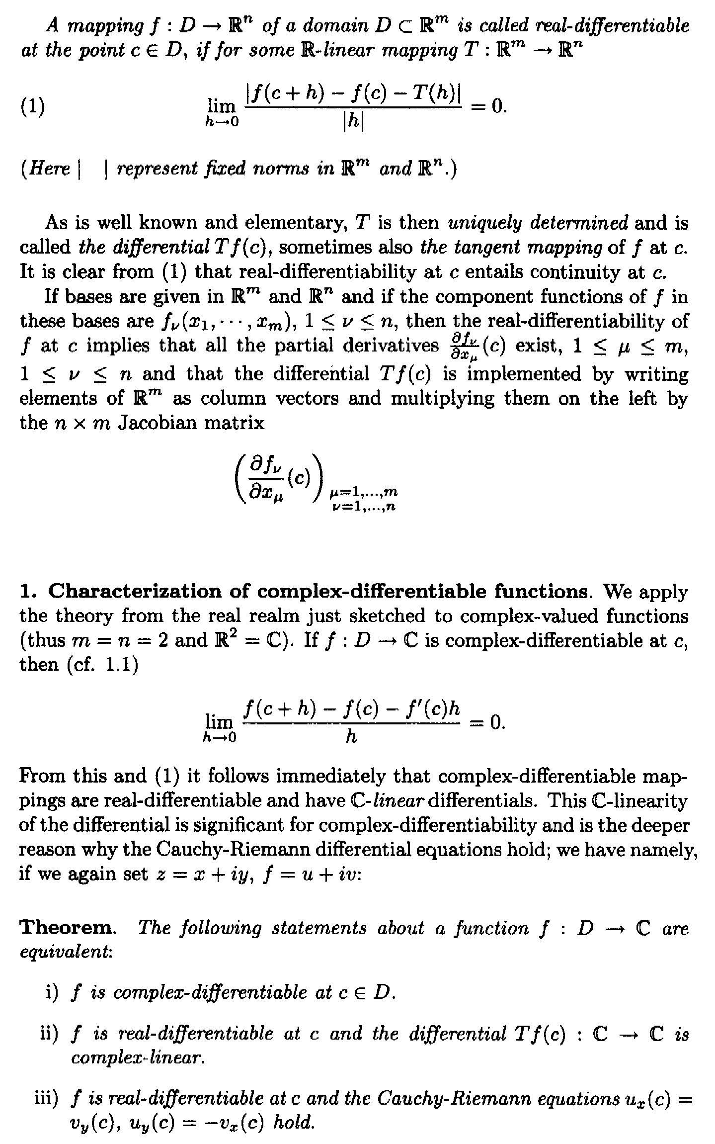 " ... ... If $$f : D \to C$$ is complex-differentiable at $$c$$ then ...$\displaystyle \lim_{ h \to 0 } \frac{ f(c + h ) - f(c) - f\, ' (c) h }{ h} = 0$From this and (1) it follows immediately that complex-differentiable mappings are real differentiable and have $$\mathbb{C}$$-linear differentials ... ...