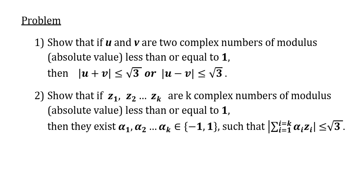 For complex numbers u = a + bi and v = c + di with moduli less than or equal to 1, it is established that a² + b² < 1 and c² + d² < 1. The sum u + v results in a modulus |u + v| that can be expressed as √(a² + b² + c² + d² + 2ac + 2bd), which is constrained by the inequality involving ac + bd. It is shown that if ac + bd is positive, then |u - v| is limited to √2, while if negative, |u + v| is also limited to √2. The discussion hints at a more complex problem that may require an inductive proof approach. The findings reinforce the relationships between the moduli of complex numbers within the unit circle.