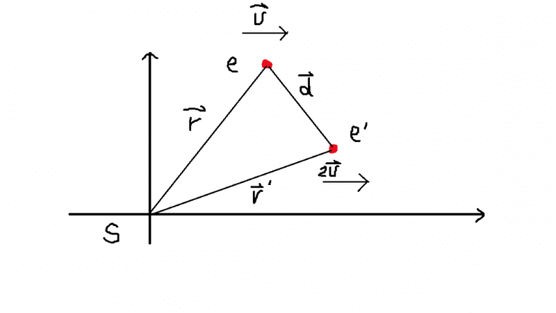 The velocity of ##e'## with respect to ##e## is: ##\vec{v}_{e'e}=\dot{\vec{d}}=\dot{\vec{r}'}-\dot{\vec{r}}=2\vec{v}-\vec{v}=\vec{v}##