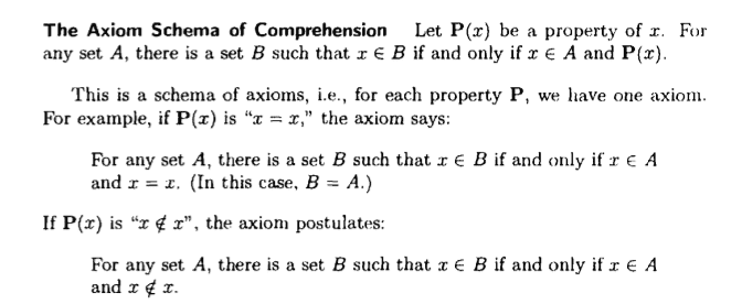 - It is proposed that for any property P and set A, a subset B can be constructed containing elements that possess property P, but this construction is limited to a predetermined set A to avoid inconsistencies.