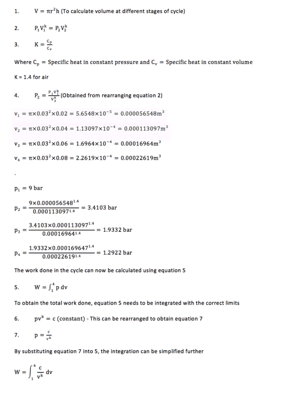 Hi, I posted a question a while ago which I have managed to do some more calculations for. I need a bit of help to see if they are correct. I am trying to obtain power and torque values at different rotational speeds of a single cylinder compressed air engine. The inlet pressure into the engine is a constant 9 bar and the air is discharged from the chamber as the piston reached BDC rather than a conventional cam valve design. My calculations below for power do no seem right compared to MATLAB and experimental results.
