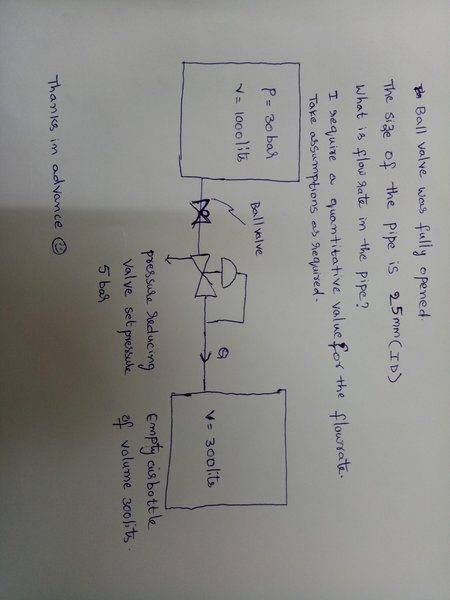 The discussion revolves around calculating the flow rate of compressed air from a pressure-reducing valve connected to an air bottle. Participants explore various factors affecting flow rate, including pipe dimensions, pressure settings, and system configuration.
